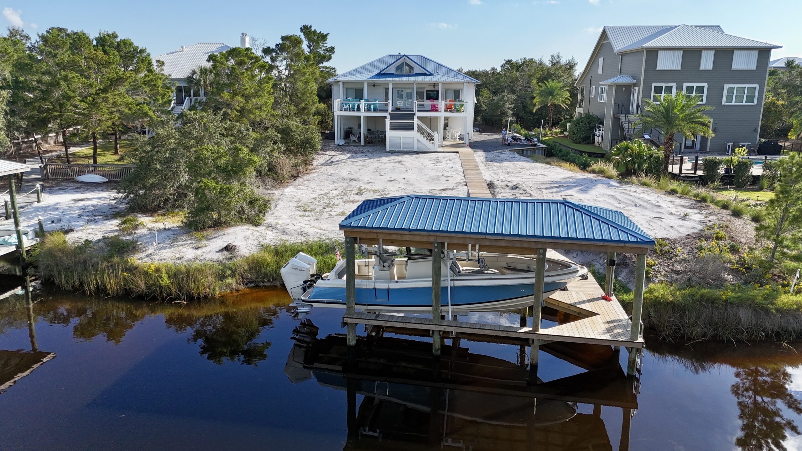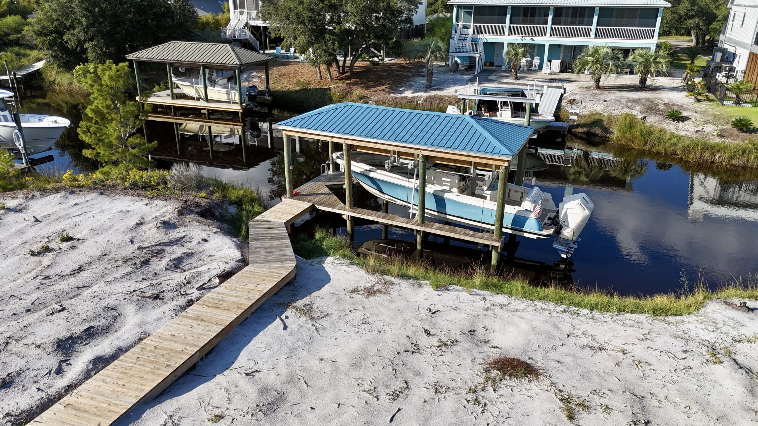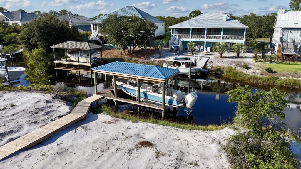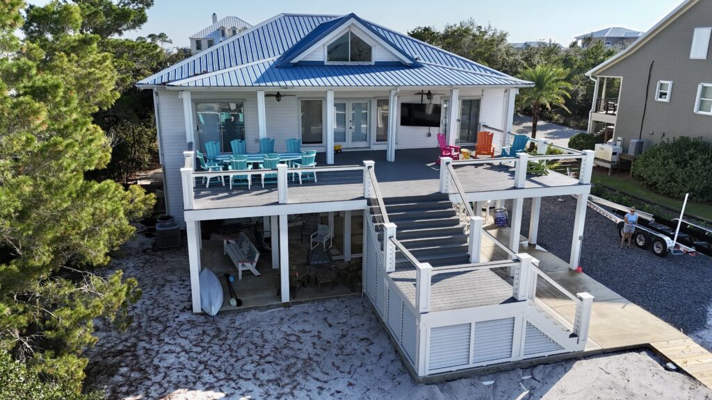 This beautiful home on Ono Island needed a new front staircase and Deck, as well as a new back deck with a staircase. We also constructed a brand-new boathouse with a boatlift on the canal behind their house.