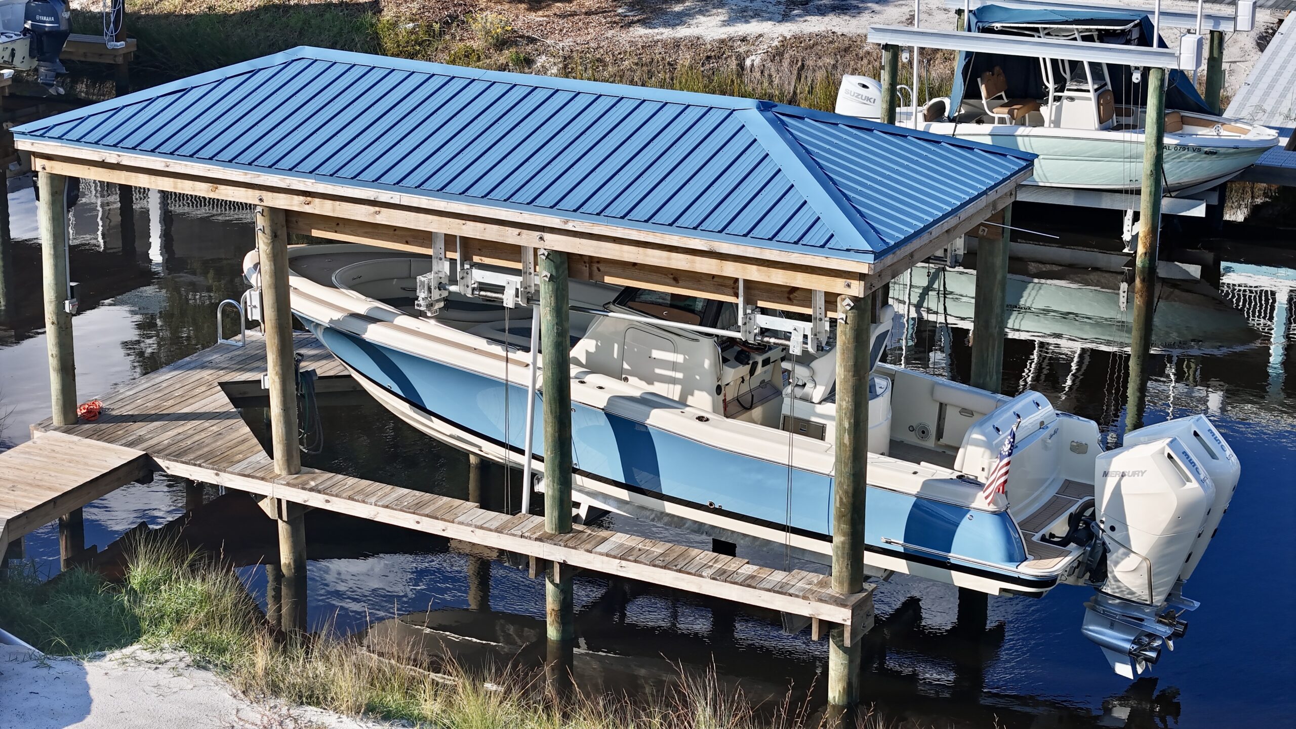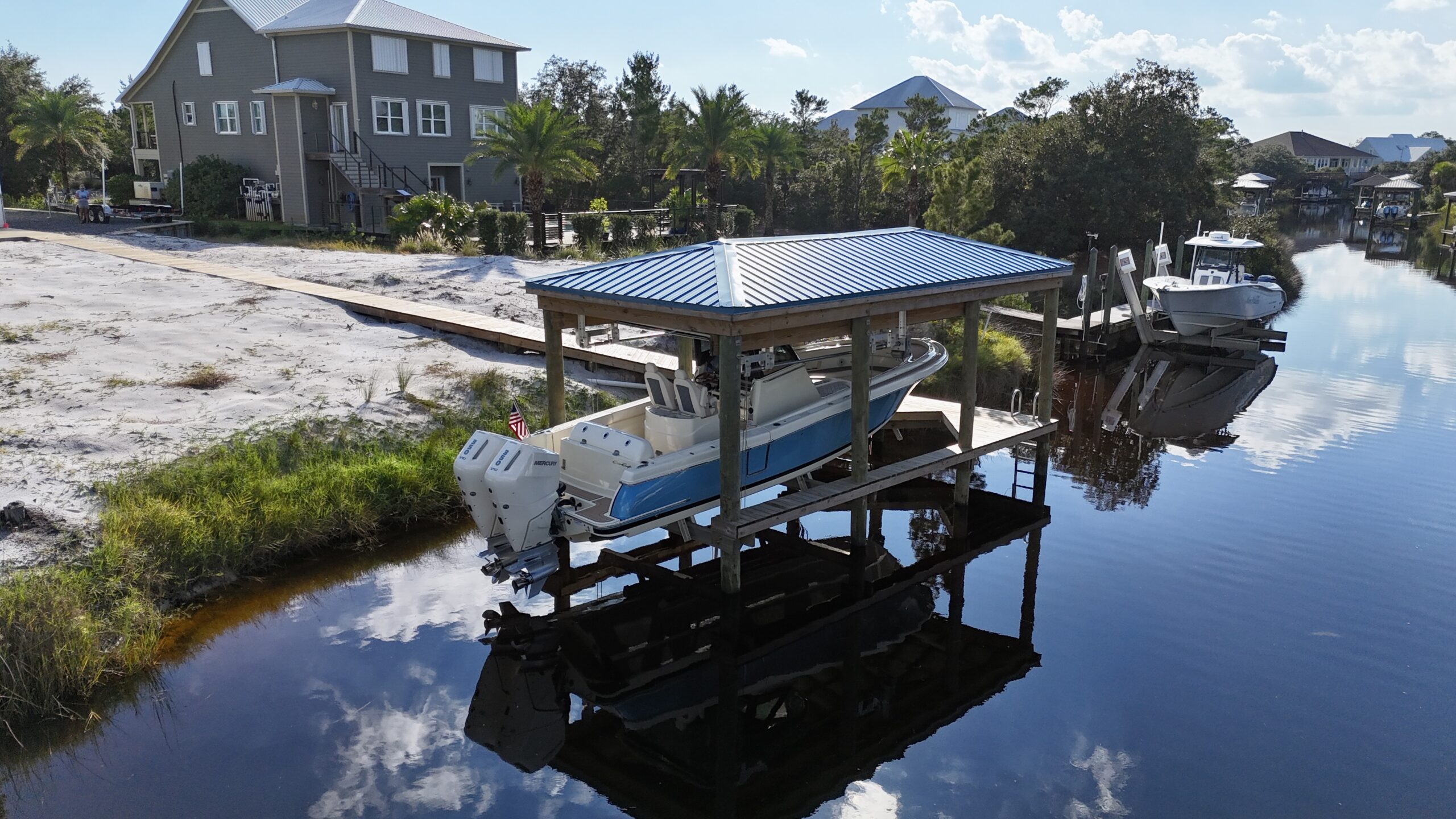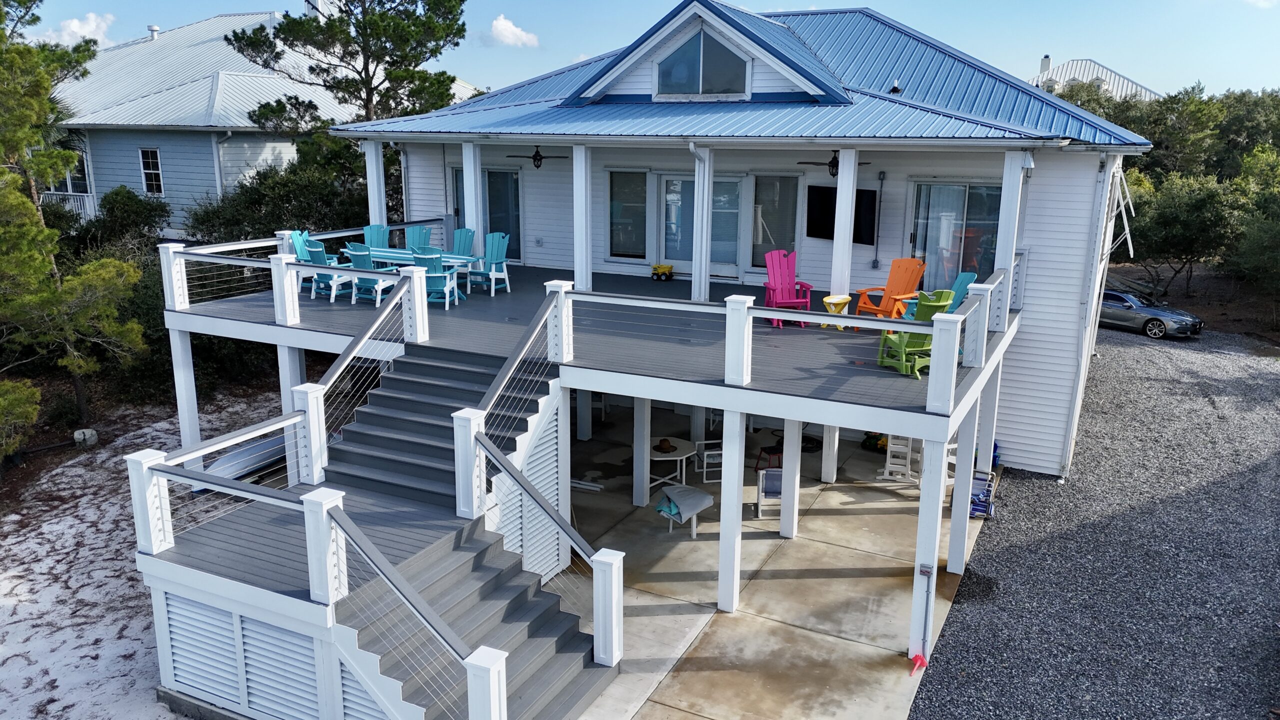 This beautiful home on Ono Island needed a new front staircase and Deck, as well as a new back deck with a staircase. We also constructed a brand-new boathouse with a boatlift on the canal behind their house.