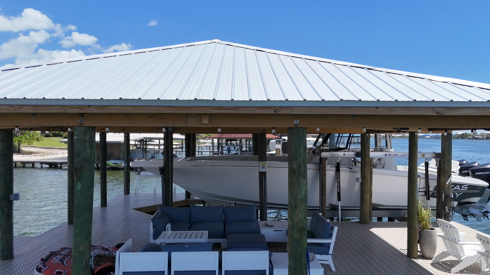The client was very happy with the finished product. The family can enjoy their waterfront home more than ever now, with covered and uncovered deck areas for lounging on a summer day. They added some nice outdoor furniture to complete the outdoor living area. The fish cleaning station will come in handy after a long day out on the boat deep-sea fishing for Snapper or whatever’s biting that day. The client also appreciates the increased property value of his Ono Island home. If he ever wants to sell the house, this boathouse will be a major selling point.