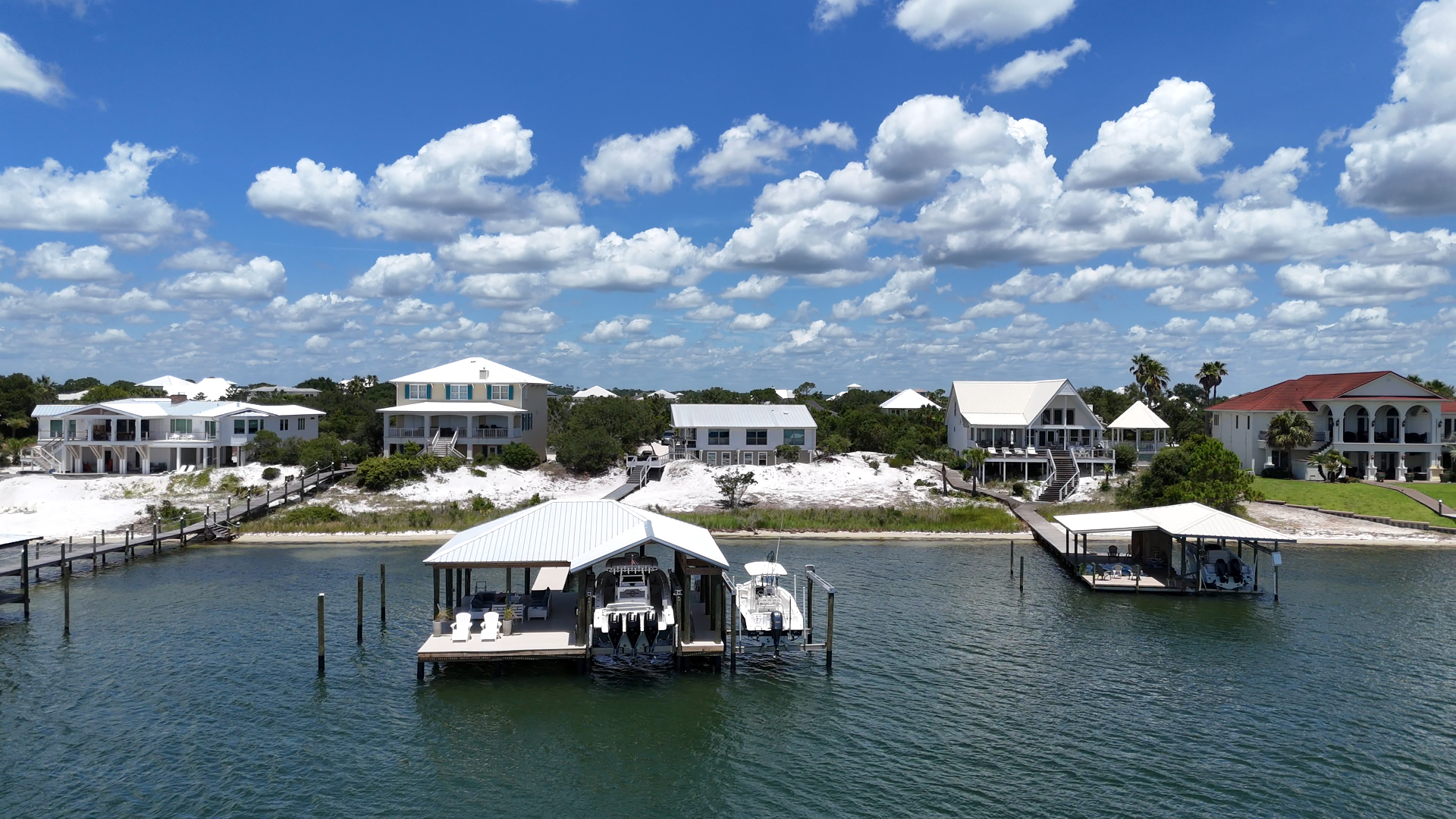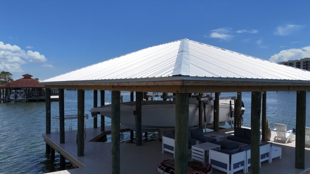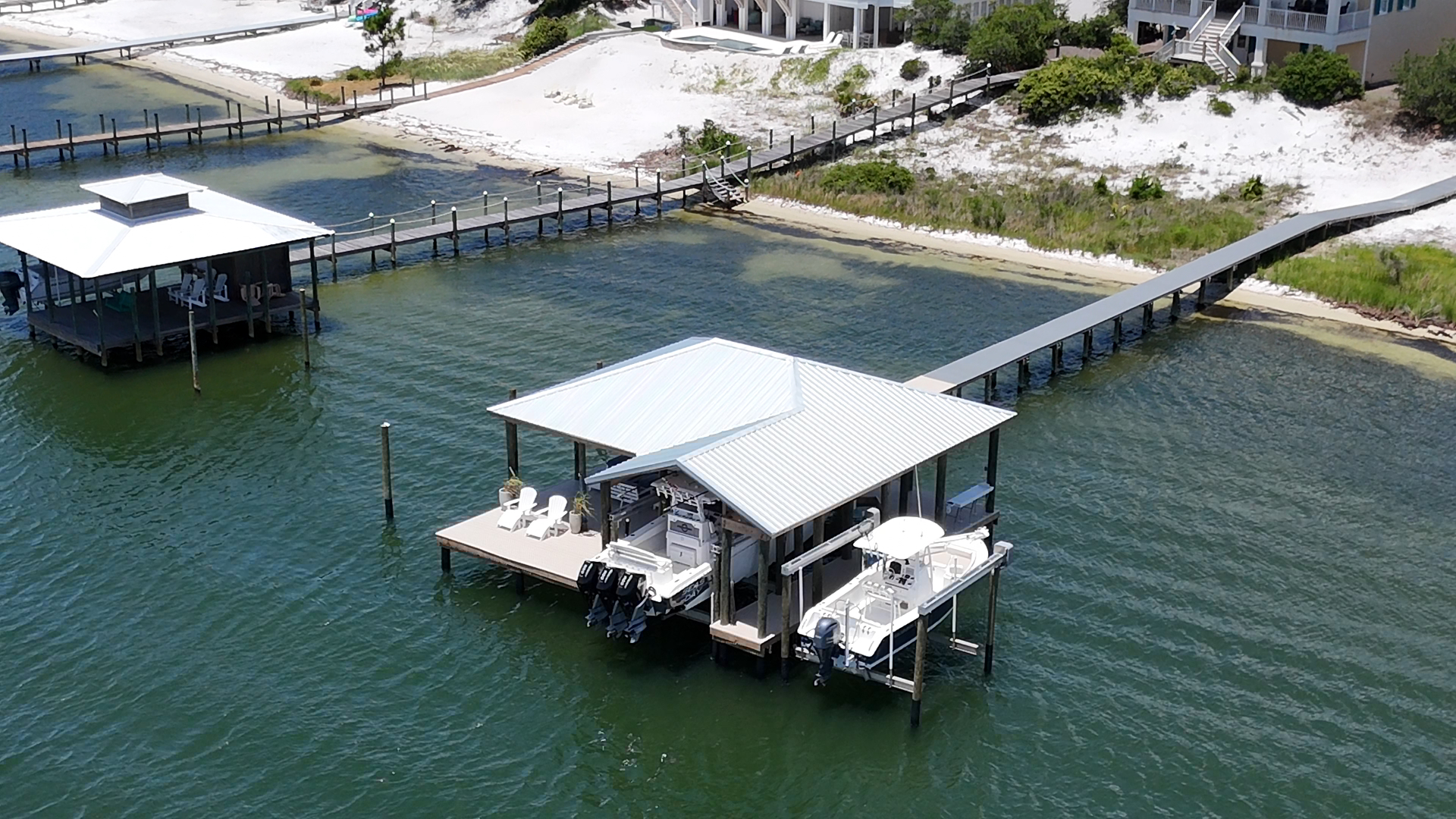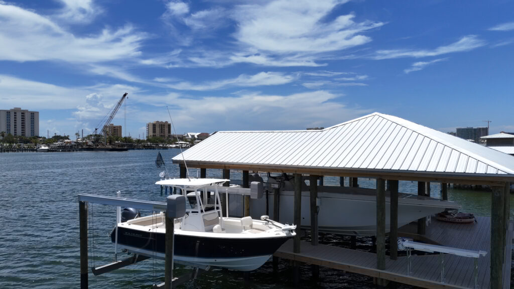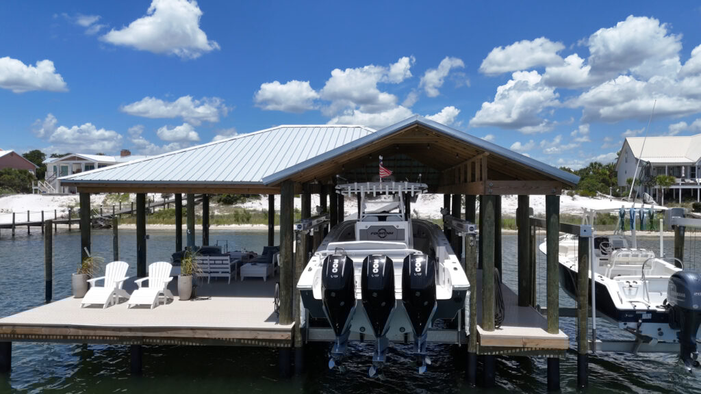 A BIG marine construction project on Ono Island – the homeowner increased his property value significantly by having GCLM construct a massive 40×40 Boathouse with 2 boat lifts (24,000 lb & 12,000 lb), a fully powered, watered and well lit fish-cleaning station, and large covered and uncovered sunbathing deck areas. Grey composite decking up and around the house with a 300 ft walkway down with Astrodeck ventilated decking to the impressive boathouse. Vinyl-wrapped pilings to protect against sea life & parasites, giving this build longevity and strength. The finished project is a sight to behold! And of course the boathouse was designed to match the main house, from the metal roof to the paint colors.
