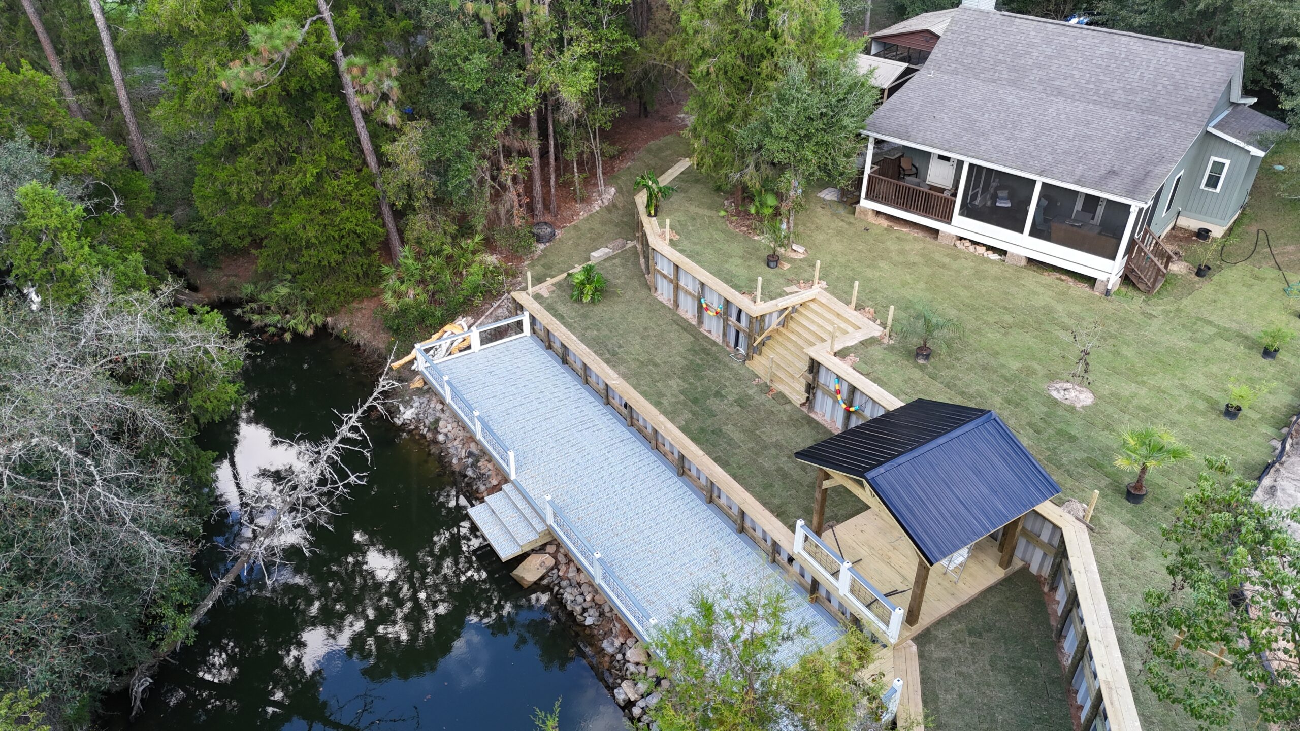 This marine construction project in Elberta is very unique – we worked with the existing landscape, reinforcing the coastline with multi-level retaining walls, with a beautiful Gazebo, 2 staircases including a grand staircase, and large flow-through deck for holding kayaks. Highest grade marine materials were used to ensure the longevity of this structure. The client asked GCLM to create this waterfront beauty for renters that she is expecting in the Spring and Summer, so that they may enjoy the water from their own private deck. This project was completed in Elberta, AL on Wolf Creek. Watch the video below for details about this project.